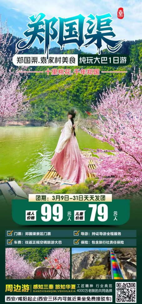 预订说明:① 早07:00指定地点集合乘车(车程约1.5小时)赴【郑国渠旅游风景区】,之后前往关中印体验地【袁家村】参观,集合乘车返回西安,结束愉快旅途!(如不成团,可安排其他行程) 儿童收费:1.2米以下儿童含车费及导服,不含景点门票,若发生其他费用客人带小孩现付。 费用不含:郑国渠景交车30元/人(必须产生) 65周岁以上老人及证件免票人员景区保险5元/人(必须产生,需要证件原件)。 推荐自费:郑国渠快艇60元/人次(约20分钟)、观光船50元/人次(约40分钟)等娱乐项目,根据您的旅程游览需要,请自行合理安排!