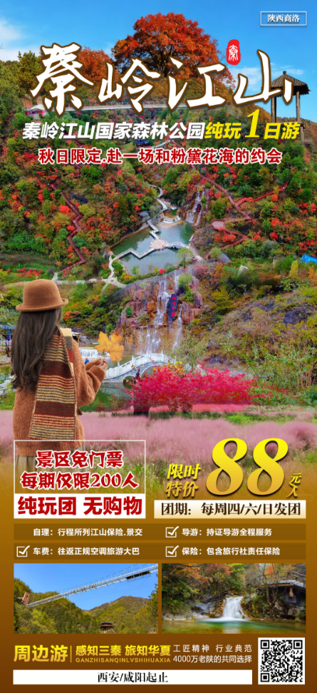 秦岭江山1日游直通车(周四/六/日) 提前一天预定 (不可退) ¥198.00¥88.00 [在线支付] 预订说明:① 包含项目: 1.交通:往返正规空调旅游车(保证每人一正座)。 2.导服:国家旅游局颁发的持证导游服务。 3.保险:旅行社责任保险(建议游客另行购买人身意外险)。 4.门票:景区免门票。 自理项目:成人景区保险10+往返景交30=40元/人【必须产生】。 2.景区玻璃吊桥+旱地滑道套票20元/人【自愿产生】。 儿童收费:1.2米以下儿童只包含往返车导,其他不含。