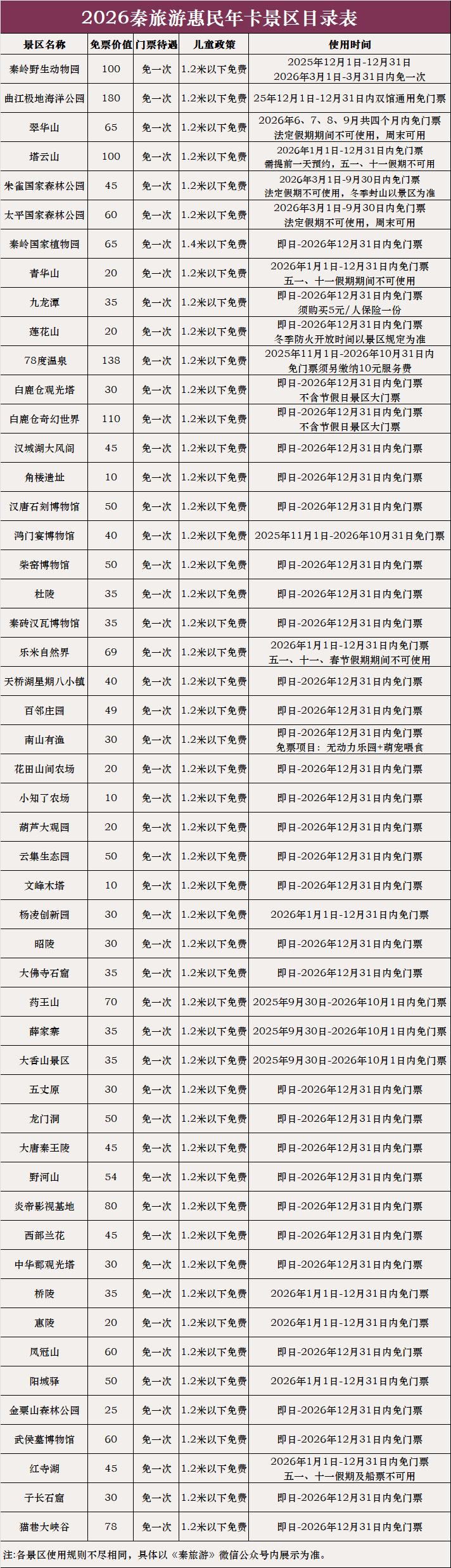 1.本年卡有效期至2026年12月31日,个别景区场馆指定日期使用有效,详情以“秦旅游”公众号内各景区使用规则为准。一人一卡,不可转借。