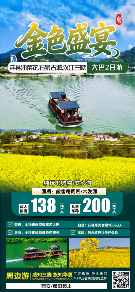 洋县油菜花.汉江三峡.石泉古城2日(每周四/六发团) 提前一天预定 (不可退)