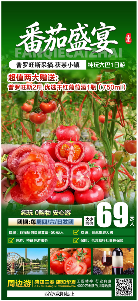 早上西安指定时间地点集合乘车(具体以导游通知为准)前往【甲邑酒庄】,这里有专业的红酒品鉴活动,带您领略红酒文化的深邃魅力。还可以亲自体验采摘番茄中的贵族“普罗旺斯”西红柿的乐趣,体味大自然的馈赠,罗旺斯以沙质多汁口感而闻名。色泽上,普罗旺斯西红柿是通体都红,切开来肉质依旧红润,这也得益于在藤上长足了日子、自然成熟。采摘结束后前往【茯茶小镇】,古朴整齐的关中特色街道、潺潺流水环绕小镇、在一间其貌不 扬的茅草铺子里参与古老茯砖茶制作……这就是位于西咸新区泾河新城县东路与高 泾中路交叉处西北角的茯茶镇,市民在这里不仅可感受神秘的茯茶文化,体验制茶乐 趣和各种关中民俗风情,也能品到各种以茯茶为原料的特色小吃。茯茶世家茯茶、茯茶酸奶、茯茶米酒、茯茶鸡……走进泾河新城双赵村,一系列茯茶特色餐饮丰富了“红辣椒、玉米棒”的关中民俗“标配”内涵,也让茯茶镇自诞生起就独具特色。游览返回西安,结束愉快旅途!