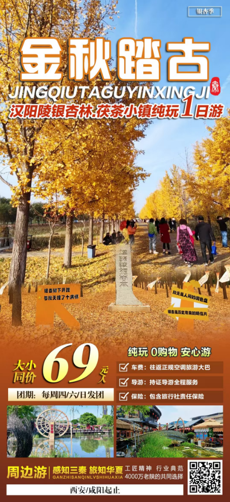 早8:00西安指定地点集合出发,乘车前往【关中民俗文化优美小镇—茯茶小镇】怀千丝万缕缘由,来茯茶小镇,你便江南梦落茯茶,热饮三杯,你便可抒怀秦楼汉瓦,看尽一蓑烟雨,十里雾花,春秋杨柳,一潭碧水指引心路放任去天涯。在这里体味亭台轩榭,品尝地道关中美食!结束后前往【汉阳陵银杏林】每年11月初是银杏林最美的时候,汉阳陵红的、绿的、黄的银杏叶层林尽染,构成了一幅色彩斑斓的油画。特别是在阳光明媚的时候,温暖的阳光普撒在叶子上,景色更是漂亮,黄透了的银杏叶飘满了枝头、堆满了地面,铺就了一条松软的路,踩上去沙沙作响。别有一番趣味。下午约16:00乘车返回西安!