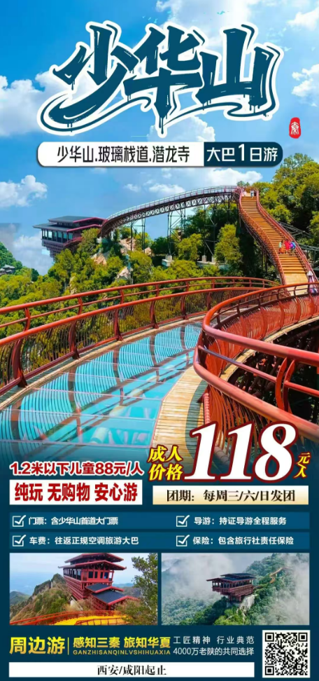 早上指定地点集合,乘车出发赴【少华山景区】。抵达后乘坐景交车游览石门峡景区,石门峡是公园的主景区,区内池潭遍布,星罗层叠。每遇峰峦交汇处飞瀑高挂,急流奔涌。在季节的变化交替中,山水倒映,五光十色。被誉为“陕西的九寨沟”。 之后乘坐少华山索道,这也是国内最长、最险的脉动式客运索道,从空中俯瞰少华山又是另一番景致:群山连绵,谷幽水秀、石奇林茂,郁郁葱葱的山体如绿色的骆驼、狮子,栩栩如生,令人赏心悦目,惊叹大自然的鬼斧神工!行走在少华山迷糊峪内的蟠龙道上,远观犹如蟠龙隐隐卧于山中,龙首阁为蟠龙之首,龙形栈道是蟠龙之身,流动的人仿佛在龙脊游走,尽情感受蟠龙蜿蜒磅礴的气势,人与自然融合为一幅美妙画卷。结束后乘车返回西安结束愉快旅途!