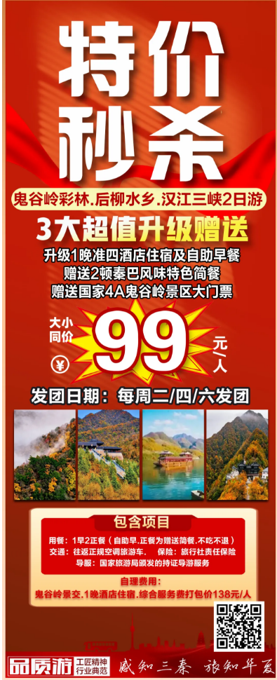 预订说明:① 包价项目: 1.用餐:1早2正餐(住宿含自助早,不用不退,正餐为赠送简餐,不吃不退)。 2.住宿:当地准四酒店标准间。 3.交通:往返正规空调旅游车。 4.导服:国家旅游局颁发的持证导游服务。 5.保险:旅行社责任保险(建议游客另行购买人身意外险)。 儿童收费:1.2米以下儿童含车费,不含景点门票、酒店床位,若发生其他费用客人带小孩现付。 必消费用:鬼谷岭景交+1晚酒店住宿及住宿+综合服务费 旅行社打包优惠138元/人(必消和团费同步收,任何优惠证件不认) 自理费用:汉江三峡游船50元/人(根据游客自身情况自愿产生)。 温馨提示: 1:特惠套餐所有证件无效!正餐为赠送,团队餐不吃不退 2:本产品为特惠产品,由于景区人多,导游有权利调整景区浏览顺序